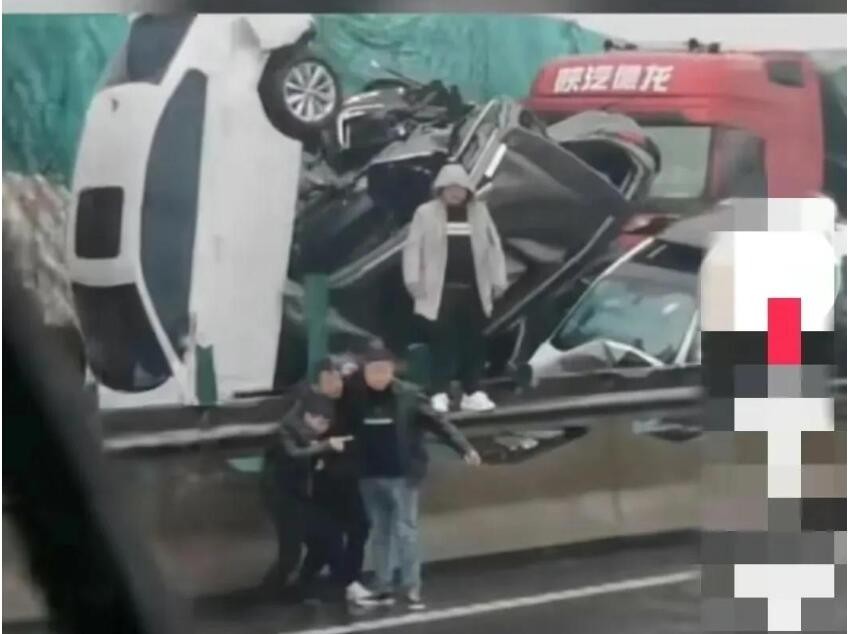现场情况也说明了这个问题,很多小车被顶上了前面车的车顶,也有的小车被挤的侧翻。
