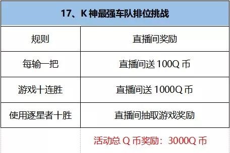 而马总首秀将和K神一起驾驶A车逐星者组成全网最强车队在高端局进行排位对战。为了本次首秀变得精彩,K神算是大大的破费了一次。在赛前就立下了Flag,每输一把就送100Q币,连赢十把直接送1000Q币。而使用逐星者十连胜的话,直播间将抽取游戏奖励送给大家!