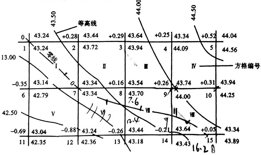 2.计算零点位置:在一方格网内同时有填方或挖方时,要先算出方格网边的零点的位置,并标注在方格网上,连接零点的为挖填方零线,即填方区与挖方区的分界线。