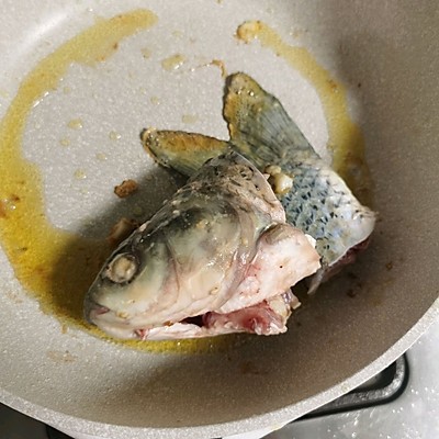 2、热锅凉油,煎鱼头鱼尾。剪至两面金黄色时,起锅。煎锅内留一些底油,把姜丝和大葱下锅,炒出香味。将鱼头鱼尾重新入锅,加入开水,大火煮开,煮大约十分钟。