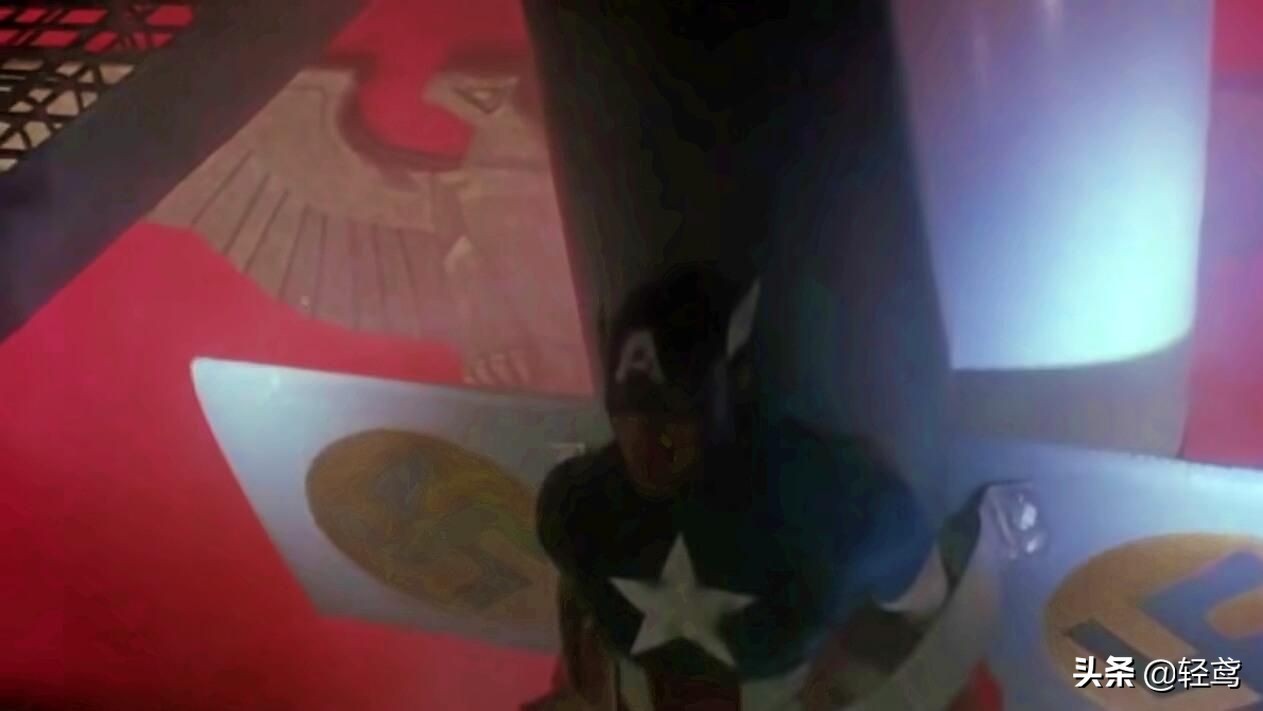 没错,队长刚打完血清后的隔天,立刻就成为战力高强的美国战士,他的目标是瞄准华盛顿发射飞弹的红骷髅,这位头部宛如过熟火龙果的反派,能力与美国队长几乎一模一样,同样力大无穷,但有更丰富的经验——人家从小就变成红骷髅了。