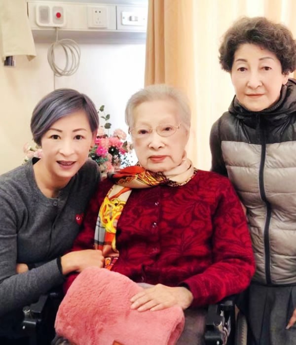 这是一张合照,坐在中间穿着红色外套,披着花围巾的是100岁的秦怡老师,右边站着的是秦怡82岁的女儿金斐姮(héng),左边依偎在秦怡身上的是金斐姮的女儿孟蔚,也就是秦怡的外孙女。