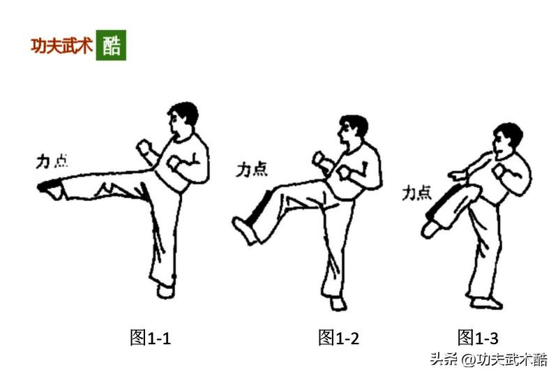 1、脚背撩踢:用脚背由下向上撩踢,力达脚背和脚尖,相当于弹(撩)腿。主要在中距离格斗中使用(图1-1)。