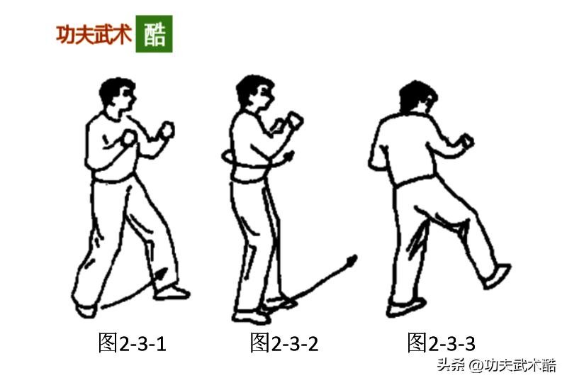 预备式为左格斗式(图2-3-1)。接上动,重心前移至左脚成支撑腿;右脚勾脚尖,向前划弧至左脚内侧,两膝相拥(图2-3-2)。紧接着,我方上身微左倾,右膝向上向外移展10厘米左右,同时以右小腿外侧为力点,由下向上、由后向前撩踢于前方,略比膝高(图2-3-3)。