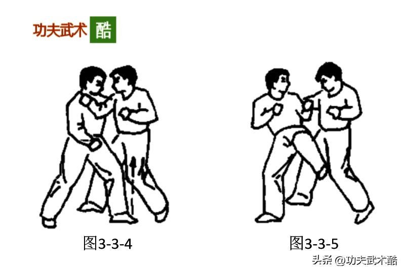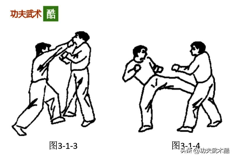 我方与敌方近距离相互扭打时,我方提右膝顶击敌方的裆部;敌方如果向后闪躲或用手阻拦(图3-2-1),此时我方可迅速变顶膝击裆为胫前撩踢击裆,加长攻击的距离,得手非常容易(图3-2-4)。