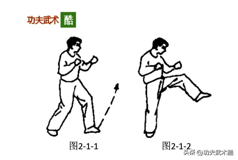 预备式为左格斗式(图2-1-1)。接上动,我方左脚微蹬地,借反作用力向前提膝弹击,力达脚背和脚尖(图2-1-2)。