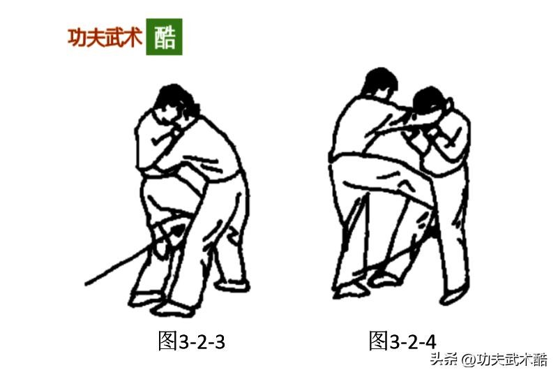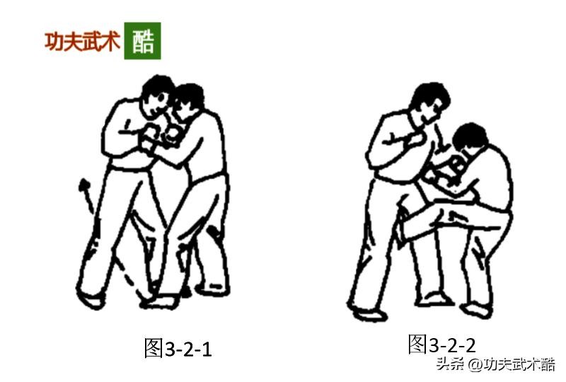 在实战中,我方与敌方近身扭打,我方可以用手抓住 敌方将其控制(图3-2-1);然后我方将左小腿胫骨部位由下向上猛地一挑,敌方必败而绝无再战之力(图3-2-2)。
