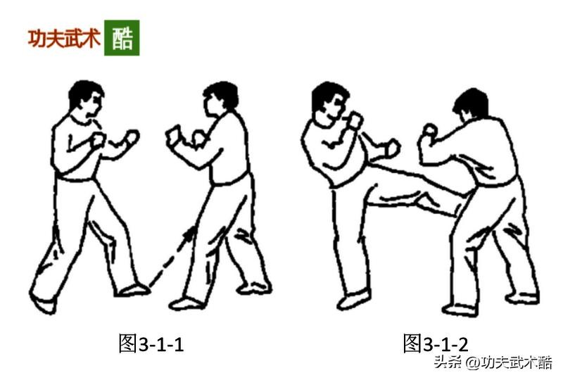 敌我双方均以左格斗式站立(图3-1-1)。我方可以用眼睛迷惑敌方,并用嘴佯装与敌方理论,将敌方的注意力吸引到上盘,然后我方以余光窥视敌方裆部,并快速以左脚(前脚)突然发起攻击,将敌方裆部踢中(图3-1-2)。