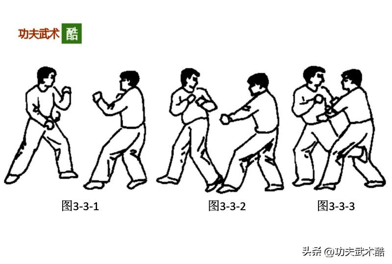 敌我双方均以左格斗式站立对峙(图3-3-1)。我方突然向右侧身,迷惑敌方以为我方会以左鞭拳或左翻背拳进攻其头部左侧(图3-3-2)。此时我方趁敌方注意力在上盘,突然将左腿提起,用脚外侧撩踢敌方裆部(图3-3-3)。