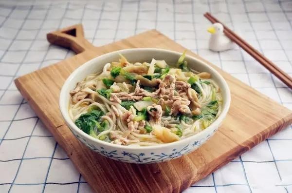 7.放入金针菇和油菜心,烫软,和米线一同捞出。