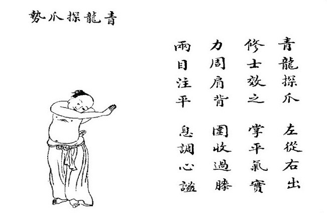 另一方面,中医脏象学说认为,肝与胆、目、筋、爪等构成肝系统。肝在五行中属木,与四时之春相应。而本式主要是锻炼肝胆,其动作手形似龙爪,取名青龙探爪势,乃是取其形及象。如文献口诀:“青龙探爪,左从右出。修士效之,掌平气实。力周肩背,围收过膝。两目注平,息调心谧。”、“青龙探爪,左从右出,左掌纠行,蜷傍胁部,右爪乘风,云门左露,气周肩背,扭腰转腹,调息微嘘,龙降虎伏。”其意思是:青龙探爪势,左掌握固于腰胁部,以左肘尖领劲向右后退转带动腰身左转,通过腰肩背的传带用力,使右爪向左方“探爪”,如乘风浪一般地动,似波浪相连,节节贯穿,相应地向左侧面“探爪”抓去。同时配合呼吸调节,如探爪同时撮唇吐气发“嘘”音。并注意把左边的“期门”“云门”张开,右边的“期门”“云门”闭合。当右掌前探及探地下按划弧过膝或达脚侧时,力注肩背,动作自然、协调,一气呵成。本式动作要求在松静自然中完成,具有调息宁神,气血运行,强身健体、防病、延年、益智之效。再有五行学说有左青龙右白虎之说,中医学又有左肝右肺之说,本式的“期门”“云门”是肝肺两经的要穴,“期门”“云门”的开合启闭是肝肺两经的锻炼,因此称本势是降龙伏虎的动功。