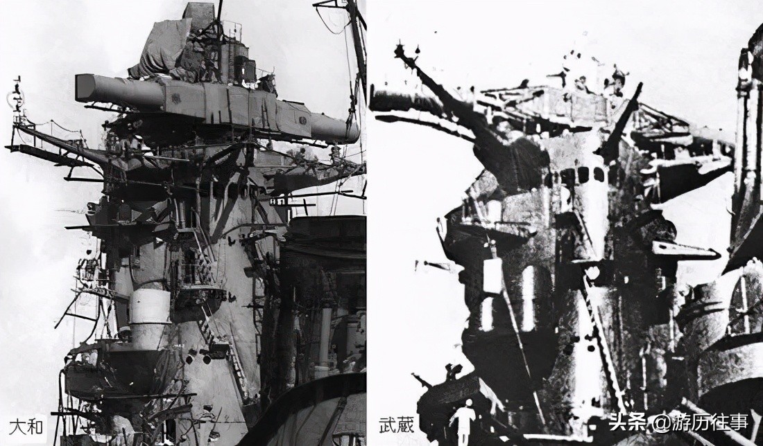 战舰大和同武藏舰桥背面对比,左边为大和号1941年9月22日在吴工厂舾裝舰桥,右边为武藏号1944年6至7月在伊予滩,此时舰桥上已经加装了21号电探。