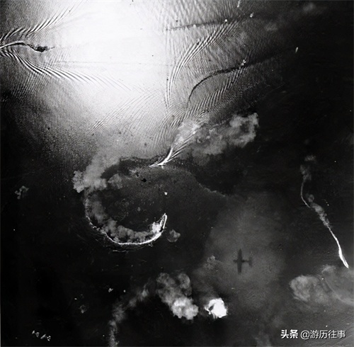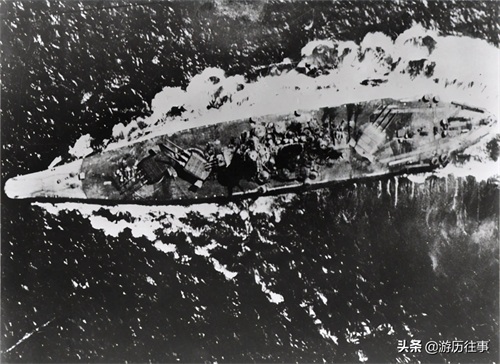 1945年4月7日4月7日凌晨,美国潜艇在九州岛西南海面发现了这支舰队。12时31分,美国海军发出的第一个攻击波,美国飞机集中攻击“大和”号左舷,有4枚炸弹落到了“大和”号第3号主炮塔附近,其中2枚225公斤炸弹穿透了后部主甲板爆炸,将战舰后部的155毫米副炮和预备射击指挥所炸毁。12时43时,大和舰左舷前部被1发鱼雷命中,“大和”号航速降至22节。图为以时速27节急转弯。