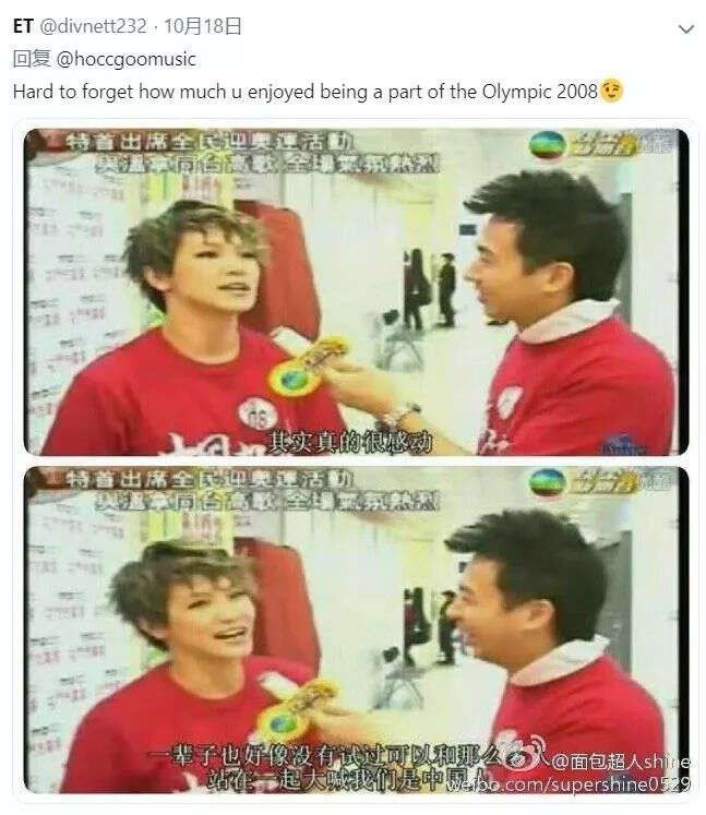 那几年,何韵诗经常在内地工作,包括北京申奥时,她还身穿写有“中国”字样的红T,表达自己作为中国人的骄傲。