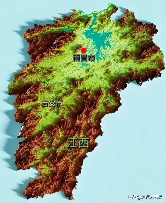 江西省地形图。地貌以江南丘陵、山地为主;盆地、谷地广布