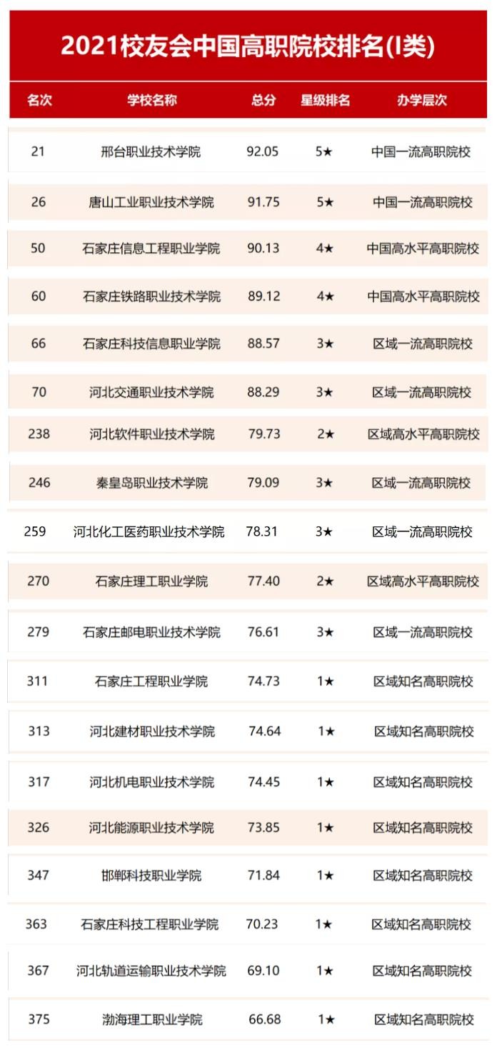 2025年校友会中国高职院校排名(Ⅰ类)中,邢台职业技术学院排全国第21名,列河北省第1,唐山工业职业技术学院排第26位,列河北省第2,石家庄信息工程职业学院(50)、石家庄铁路职业技术学院(60)、石家庄科技信息职业学院(66)、河北交通职业技术学院(70)排名进入 全国100强。