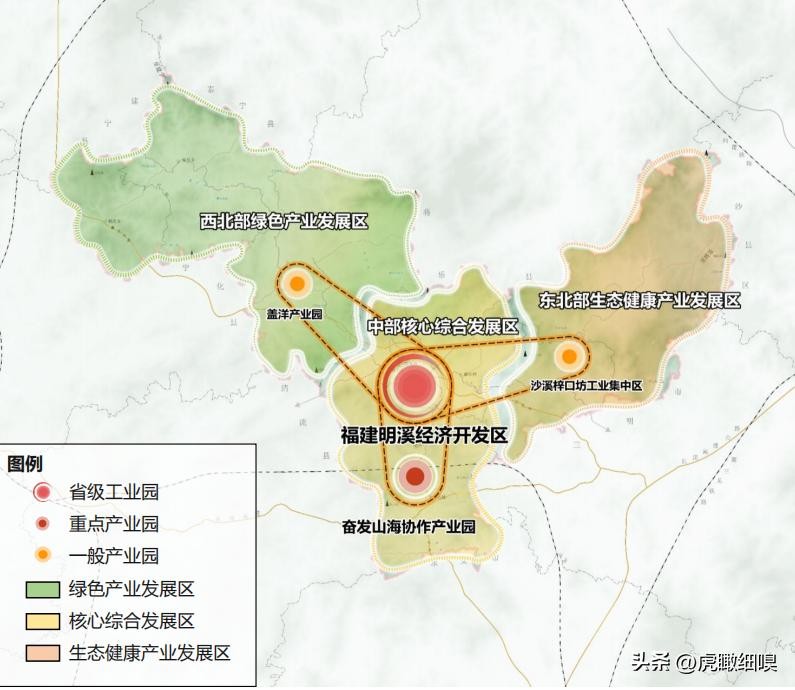 三区:逐步形成中部核心综合发展区、西北部绿色产业发展区、东北部生态健康产业发展区等三个区域。包含明溪奋发山海协作产业园、梓口坊工业集中区、盖洋产业园,凝聚高质量发展载体,推动企业集聚发展,鼓励企业退城入园。