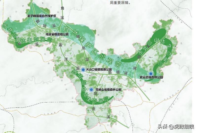 一带:君子峰自然保护区生态景观保护带。依托君子峰保护区构建生态自然景观主廊,加强生态修复和生态空间的植被种植,充分发挥廊道的护蓝、增绿、通风、候鸟迁徙等作用。