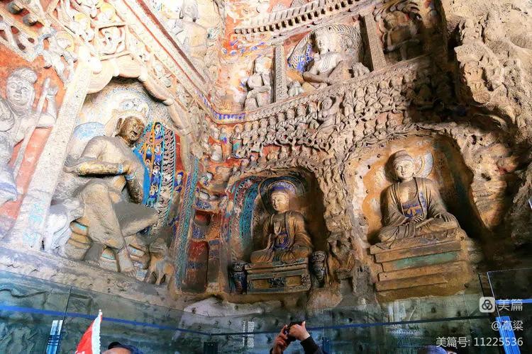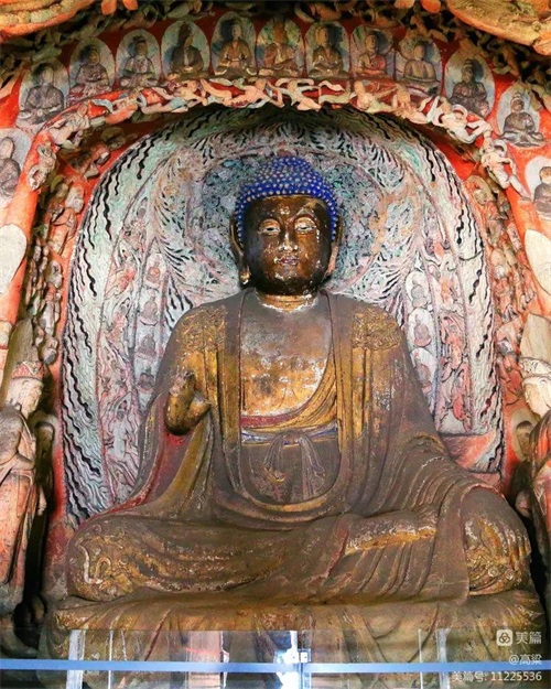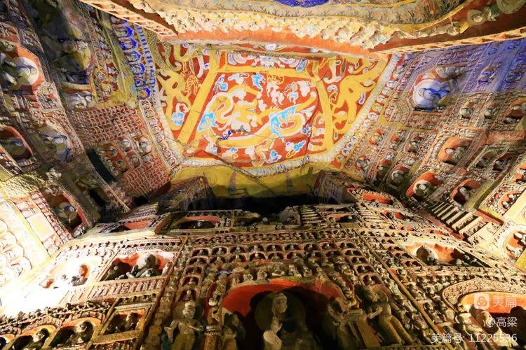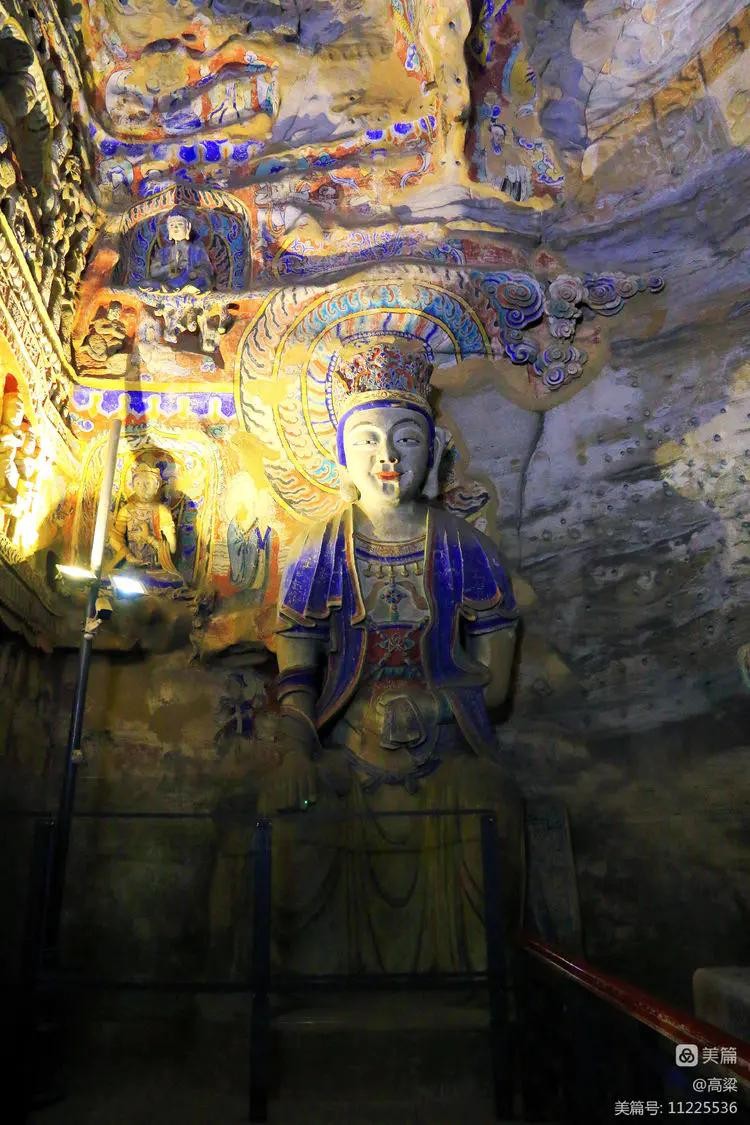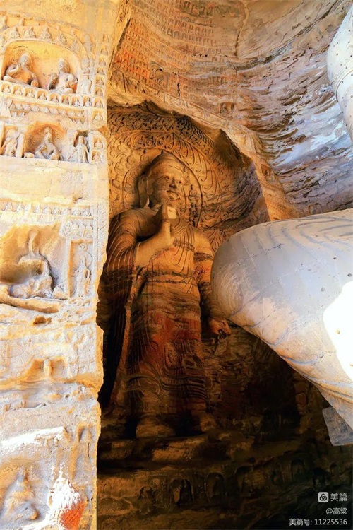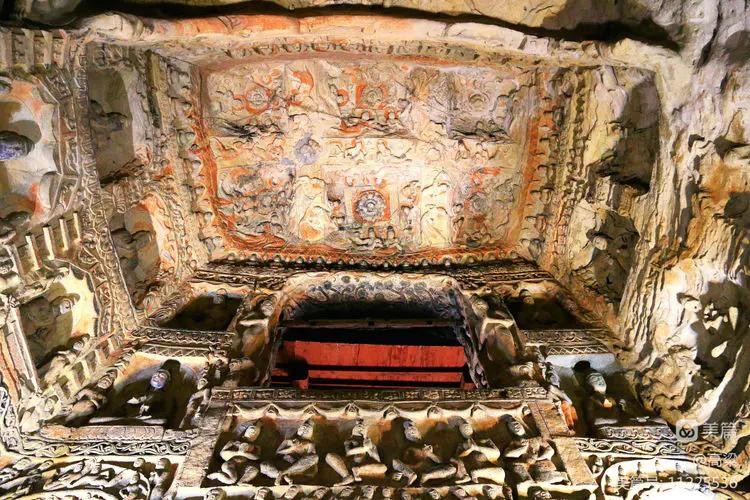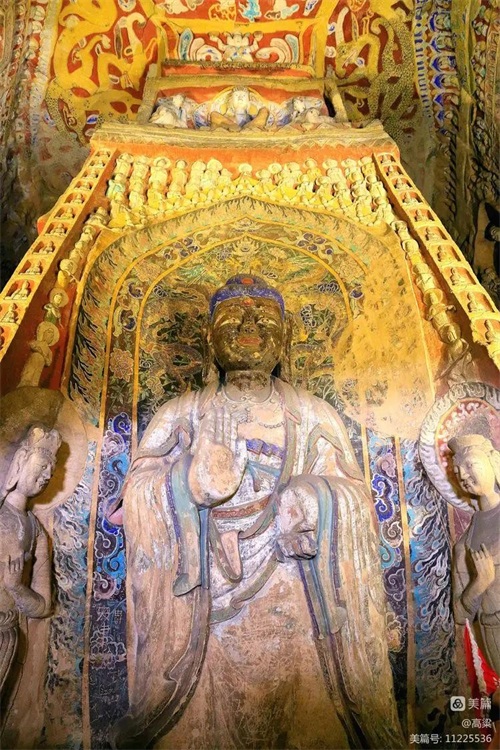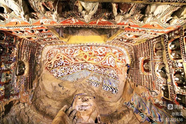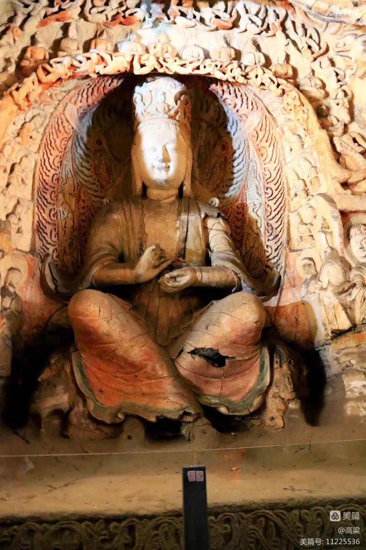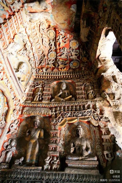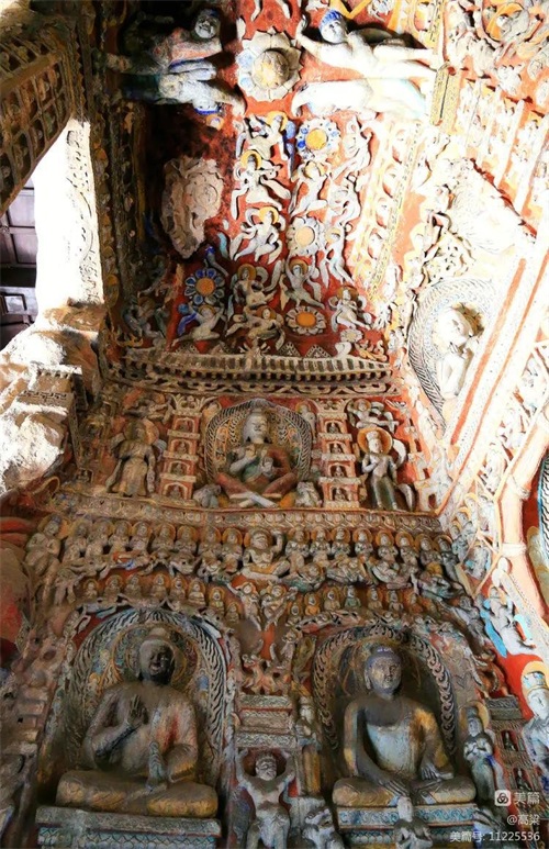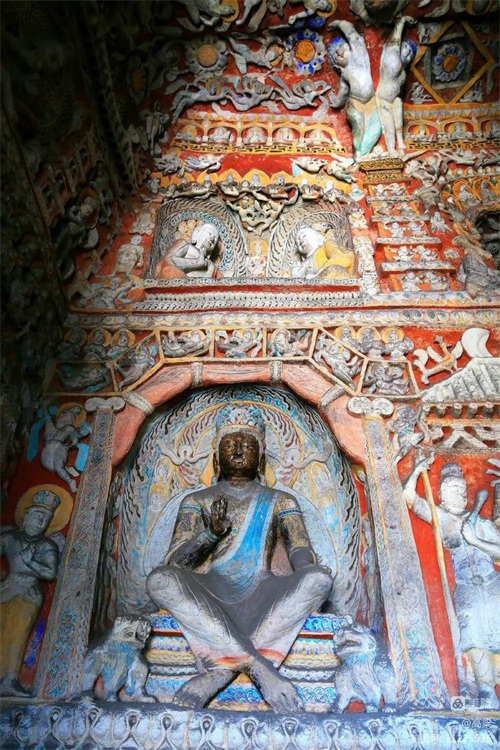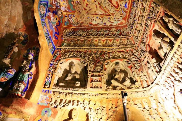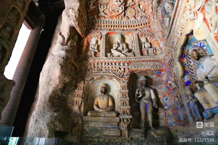 第六窟(释迦佛洞),该窟为中心柱窟,雕饰富丽,被誉为“云冈第一伟观”。窟壁布满雕塑,历经一千多年风雨和风化,颜色剥落或褪色,但仍显当年的精美与壮观,释迦牟尼佛像神采依旧