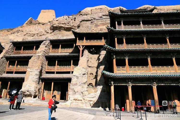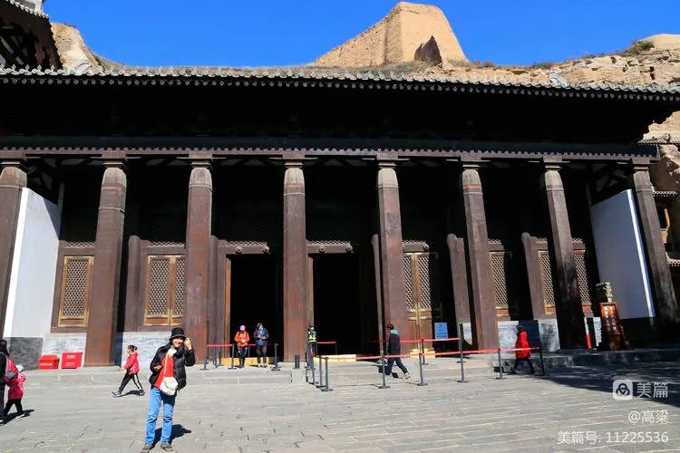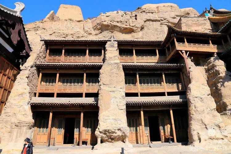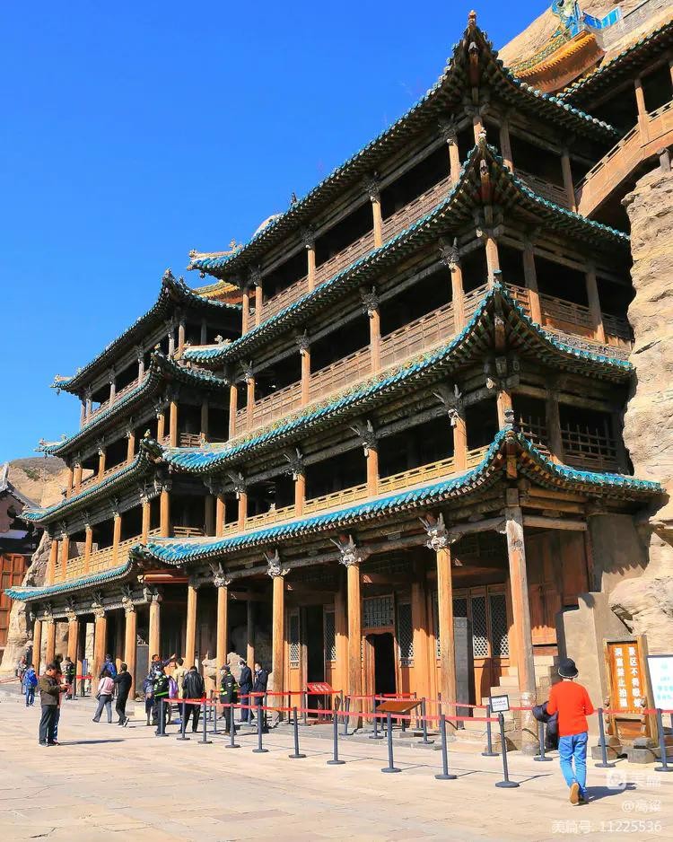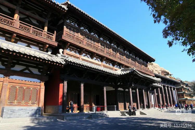 第五、六窟为一组双窟,窟前四层木构楼阁为清初顺治八年(1651)修建,因岩结构,蔚为壮观,即云中八景中的“云冈摩云”