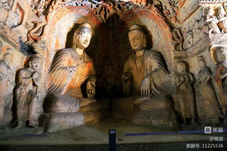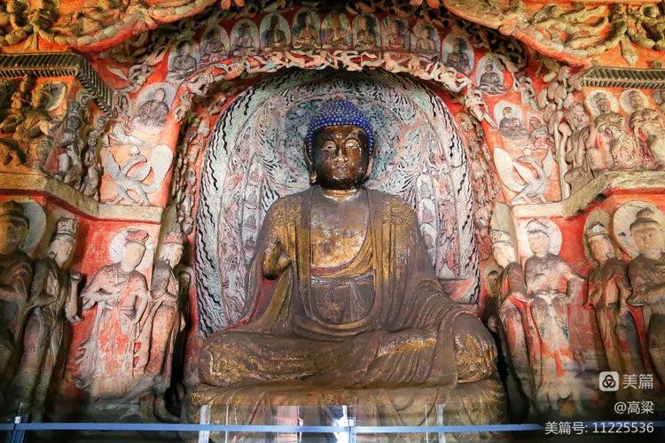 第十六、十七窟为一组。第十六窟(立佛洞),主像为释迦立佛,高13.5米,波纹状发髻,清秀俊逸。佛像身穿褒衣博带式袈裟,胸前结带下垂,属北魏太和年间推行汉化时的服制。窟内四壁及洞外壁满雕千佛,众星拱月,烘托氛围