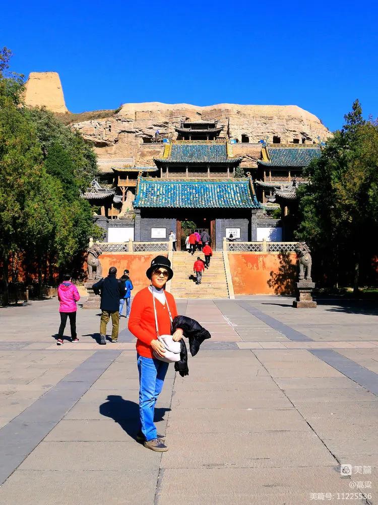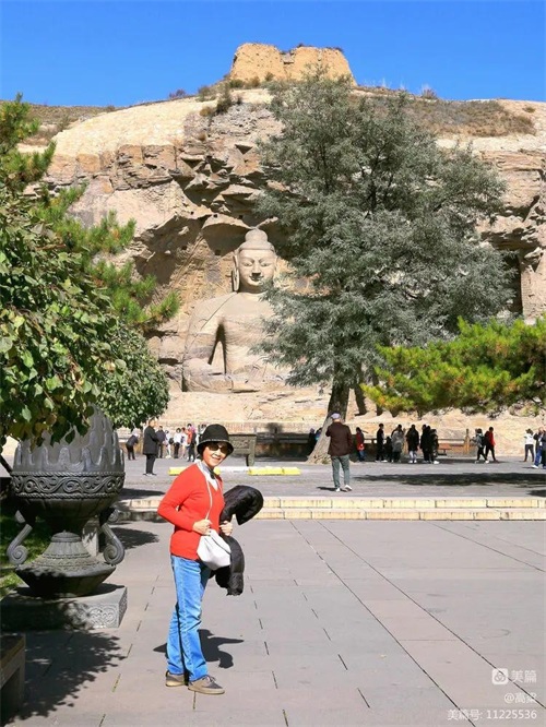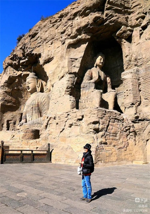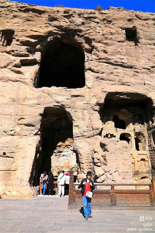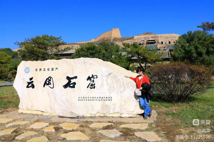 云冈石窟标志石,四个字为郭沫若先生手书。这里是云冈石窟留影纪念的最佳位置之一,后面背景是石佛古寺和高大的释迦佛洞