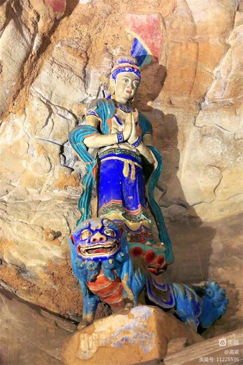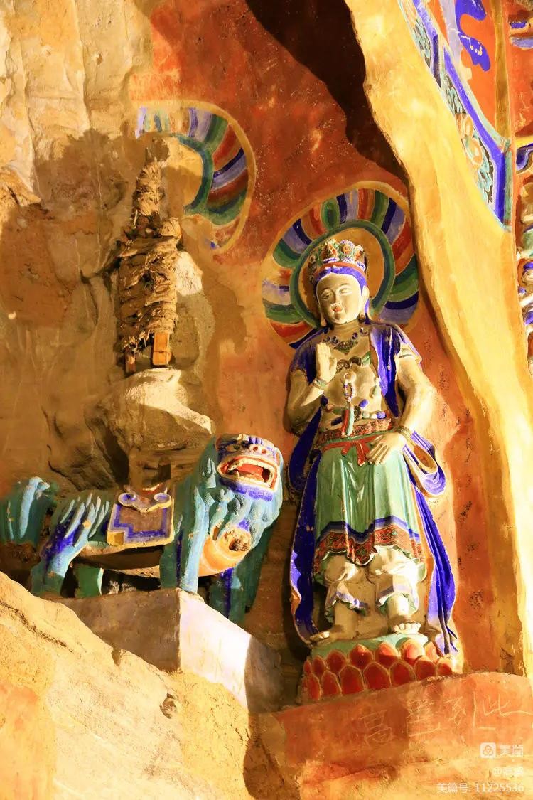 第十三窟(文殊菩萨洞),穹窿窟顶,主像为交脚弥勒菩萨,高13米,头戴宝冠,颈部戴悬铃项圈及璎珞,胸佩蛇饰,双首啣珠。右手臂肘下,一力士四臂奋力托举,势若拔山。该像经后代包泥彩绘。龛中佛像,殿堂飞阁,流苏帷帐,神龙跃动,尽显汉风,气韵高雅。