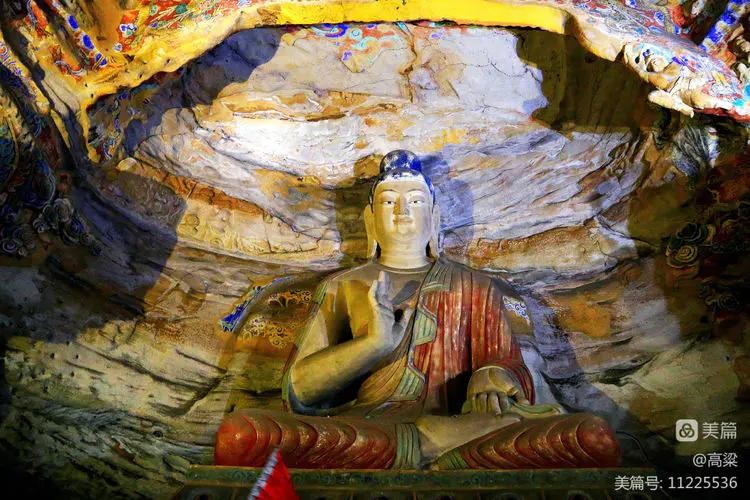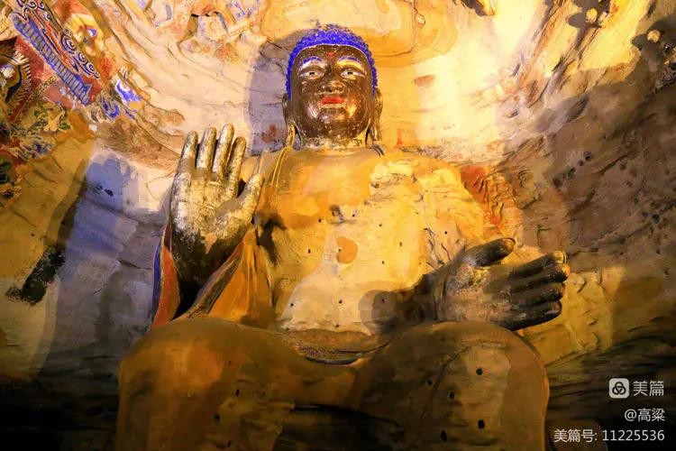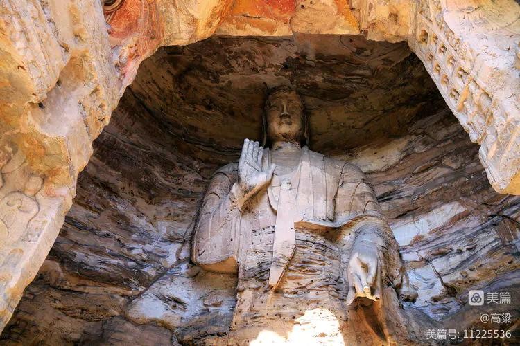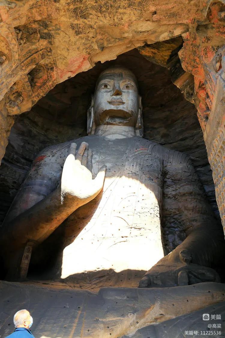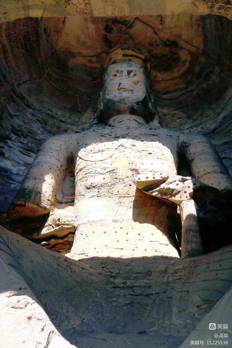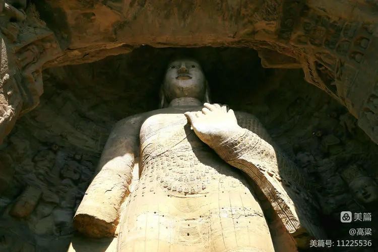 第十九窟(宝生佛洞),此窟开凿时间最早,主佛像结跏趺坐,高16.8米,是云冈石窟中第二大佛。佛像耳轮齐肩,下颌崩毁。举右手,肘下有一小柱支撑。衣纹简洁明快,轻薄贴体,袈裟边饰折带纹