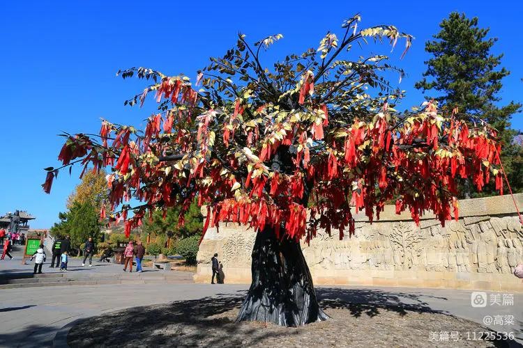 礼佛浮雕墙,佛光大道桥头处,两面相对的扇形浮雕墙,用高浮雕表现北魏皇家盛大的帝后礼佛图。两面墙中间的黄金色菩提树上挂满祈福带