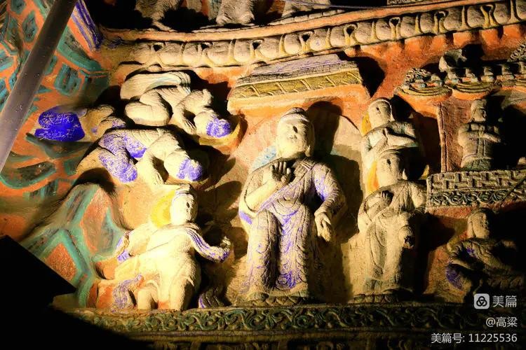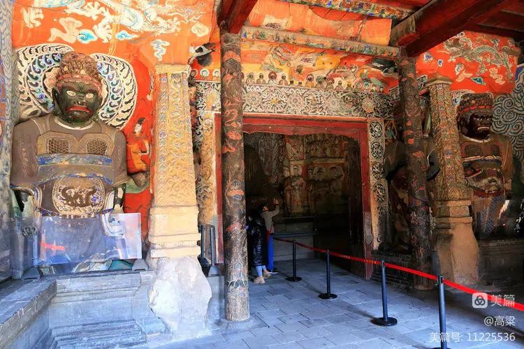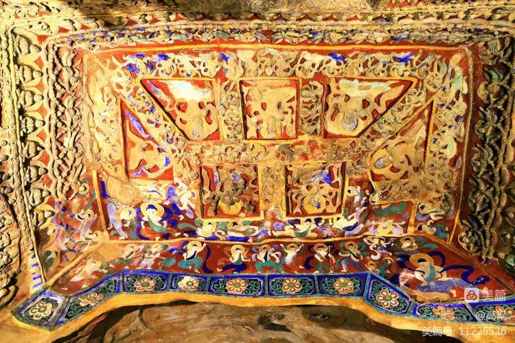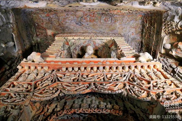 窟内中央15米高方形塔柱上下层四面开龛坐佛,四壁环列立佛,华盖承悬,气宇轩昂。系列壁雕反映释迦一生的佛传故事,雕刻手法为犍陀罗艺术东传的新创造,弥足珍贵