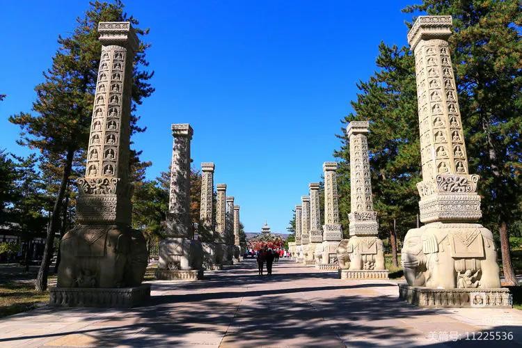 礼佛大道,从景区大门通往灵岩寺,十三对千佛柱列于大道两侧,柱高近9米,由下而上依次为须弥座、力士、白象、柱体,完美组合,精致亘绝,神柱雄伟矗立,两侧松林掩映,气势蔚为壮观,仿佛通天入地