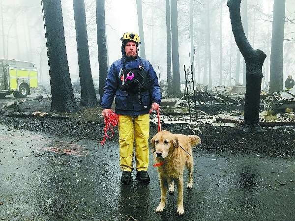 2018年11月23日,在美国加利福尼亚州天堂镇,一名救援人员在山火废墟中搜救。