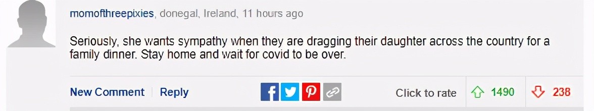 也有人说:“她在疫情大流行期间带女儿横跨美国去跟亲友聚餐,还想博得同情。在家待着等疫情结束吧!”
