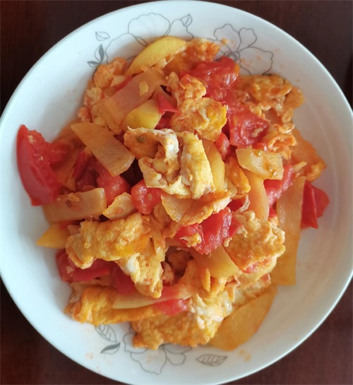 热锅热油,倒入鸡蛋液,凝固后翻面,铲成大块;土豆和西红柿一起放入,加食盐、白糖、蒜粒,炒个八九下,出锅装盘!看,漂亮吧!