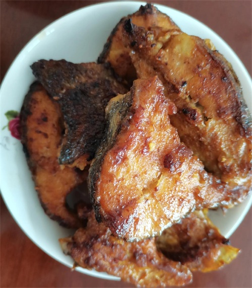黑头鱼,剪去鱼鳍,剁掉鱼头,清除内脏,切大约两厘米厚的鱼块,放入盆中。加入葱姜、花椒面抓拌一下,腌制一个小时左右。
