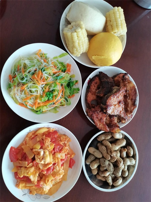 今天午餐主食是馒头和玉米,上一盘新煮的新鲜花生凑个菜!哇,四个菜呢!