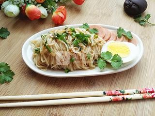 9. 将面条放入碗汁中搅拌均匀,将切好的火腿、鸡蛋、香菜摆盘即可食用。