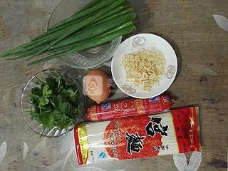 1. 原料:宫面、鸡蛋、香菜、葱、虾皮、火腿。
