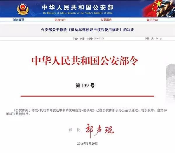 据公安部网消息,1月29日,公安部发布第139号令,《公安部关于修改<机动车驾驶证申领和使用规定>的决定》已经公安部部长办公会议通过,现予发布,自2016年4月1日起施行。