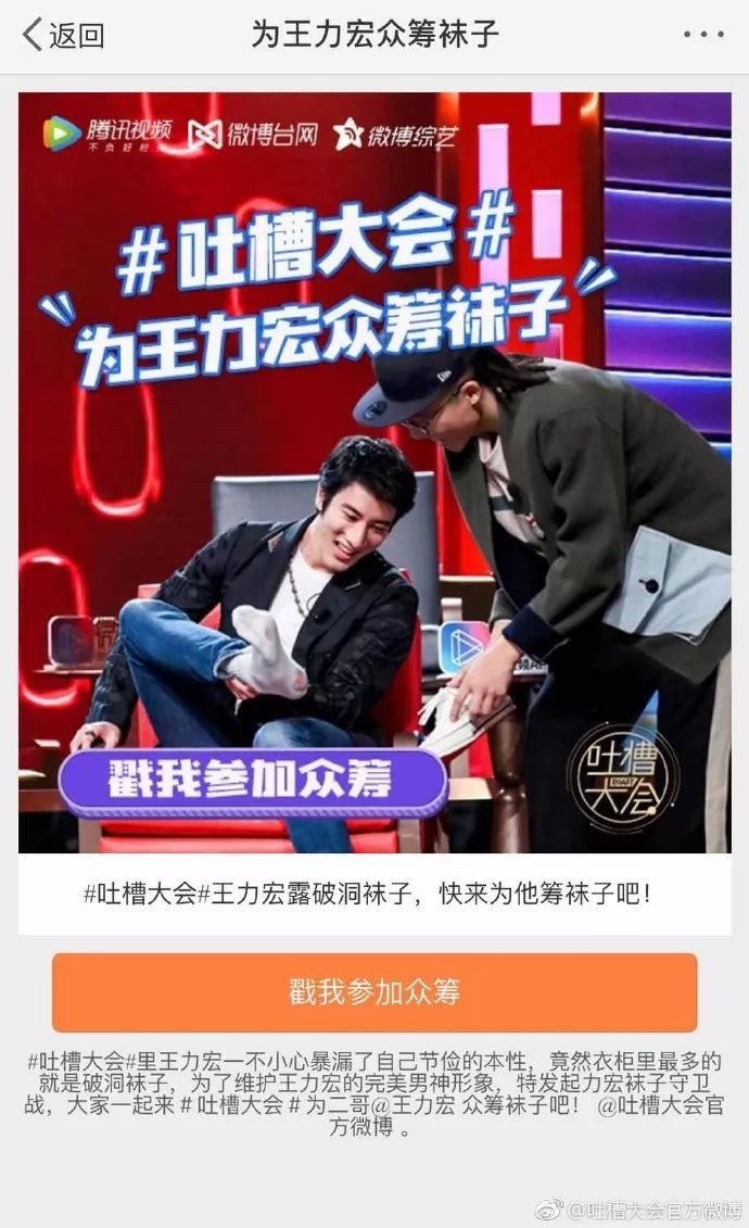 “大家快众筹给王力宏买袜子啊!你不送我不送,二哥袜子破大洞;你不筹我不筹,二哥袜子何时有”……看到王力宏脚底的那一刻,网友沸腾了,纷纷表示要众筹给男神买袜子。节目最后,池子还代表节目组送了足足有一年份的袜子给王力宏!