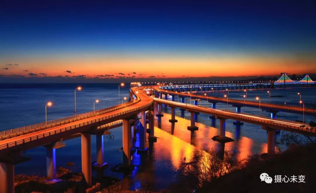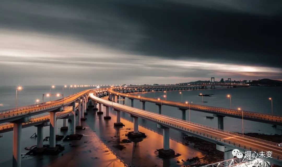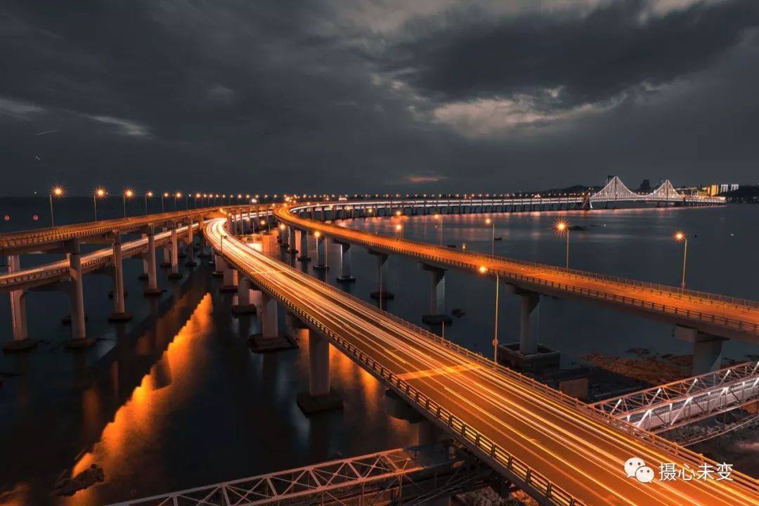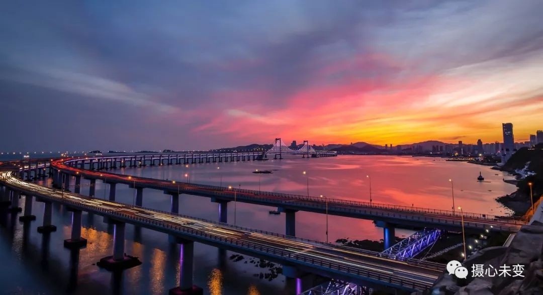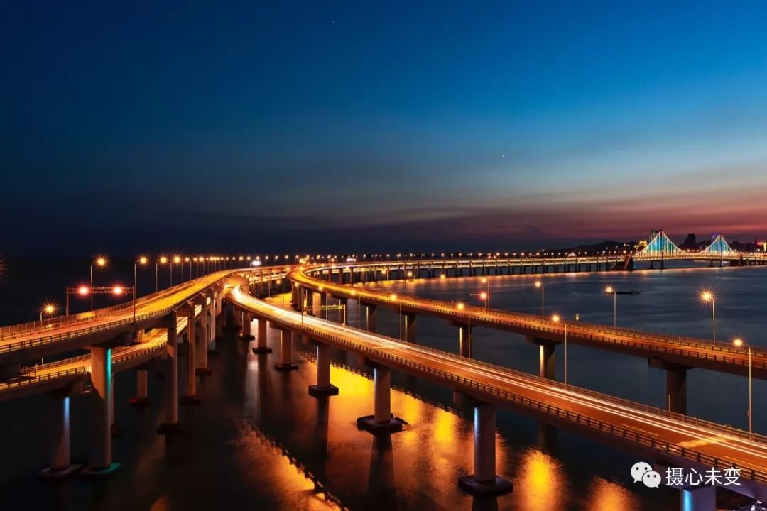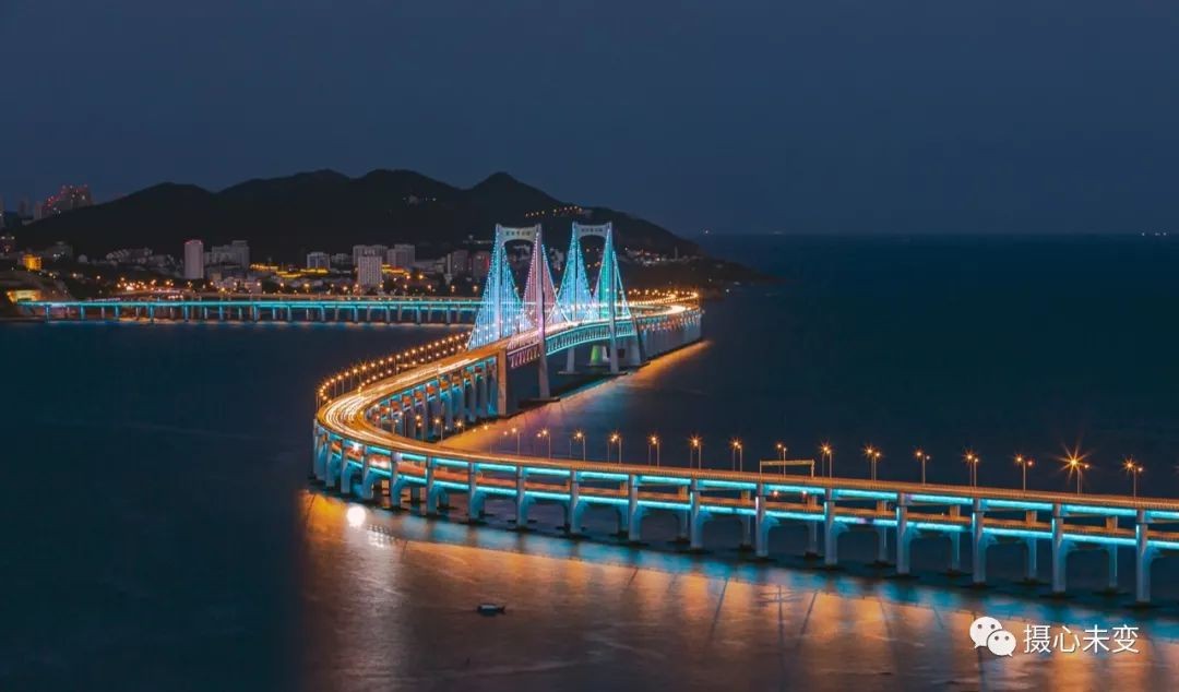 傍晚时分,华灯初上,霓虹璀璨,星海湾大桥夜色迷人,在灯光的点缀下,大桥的层次通过不同色彩变幻呈现,流光溢彩,美轮美奂...