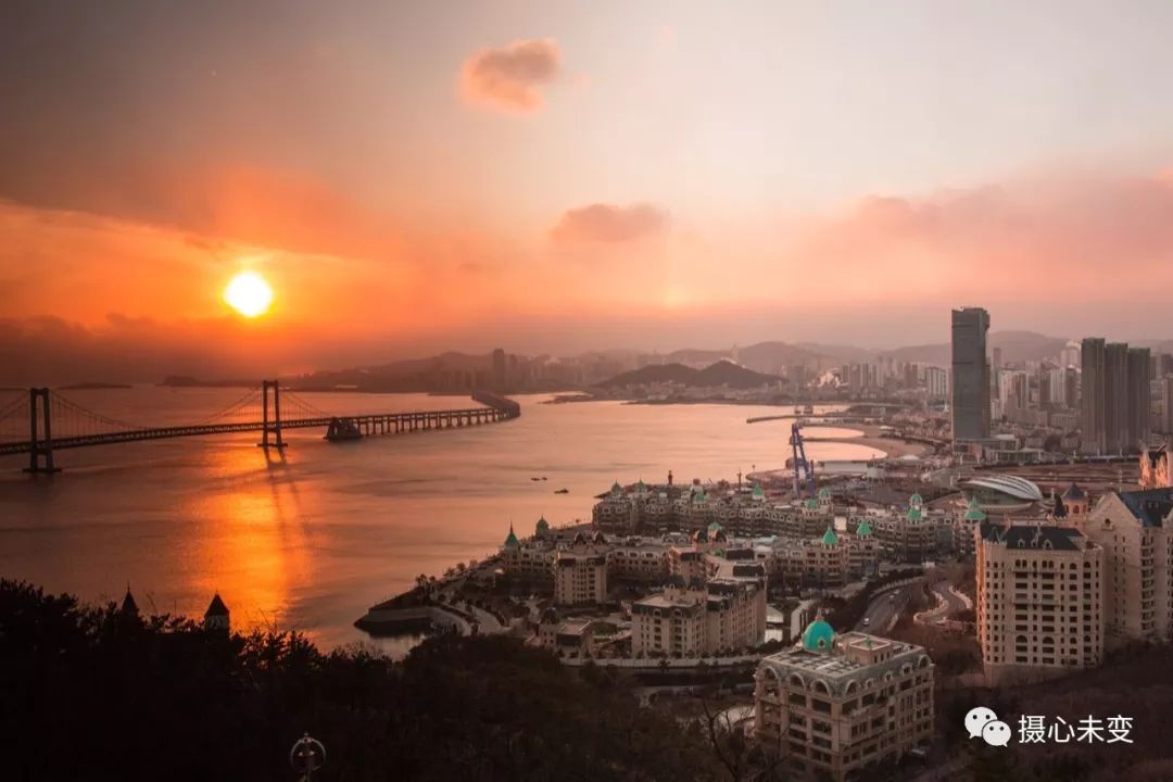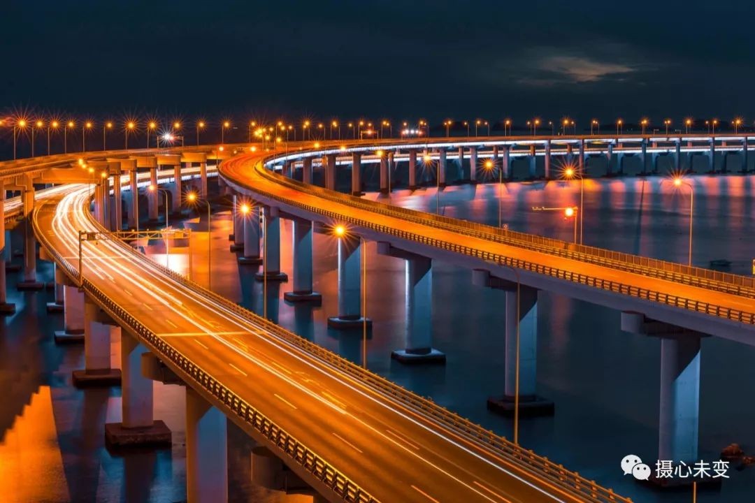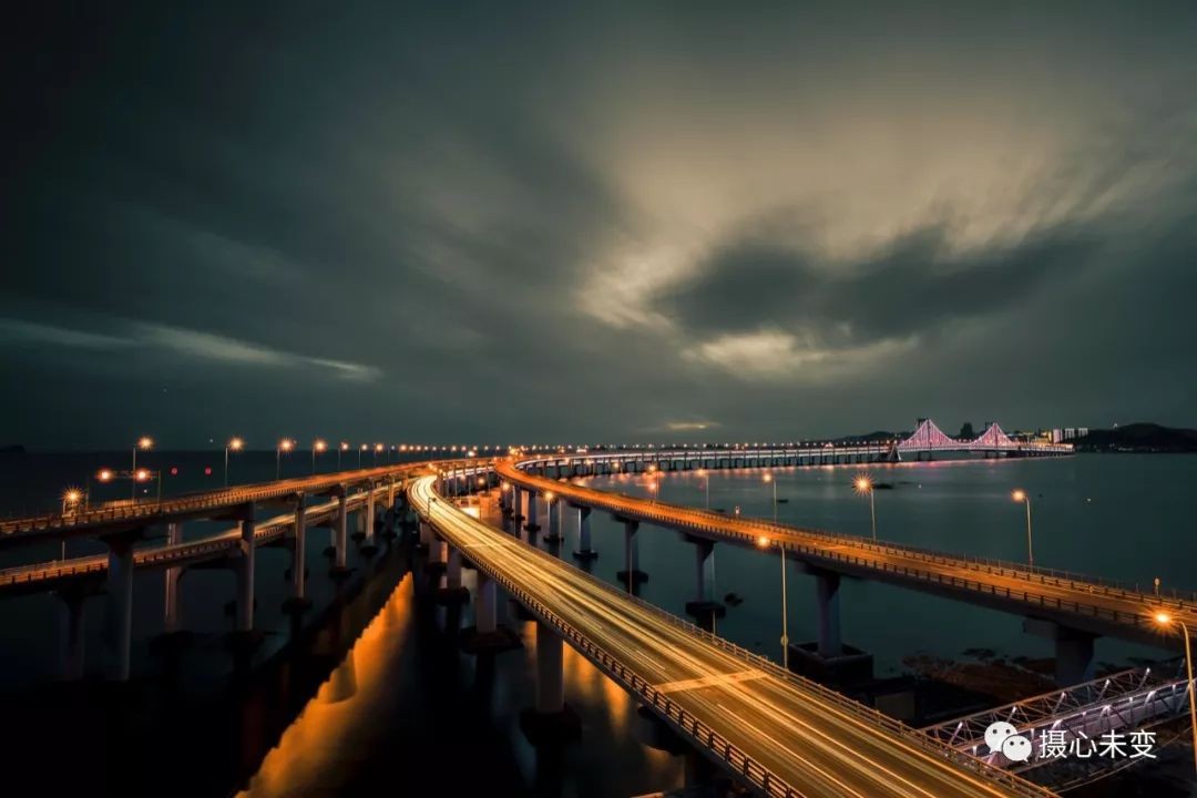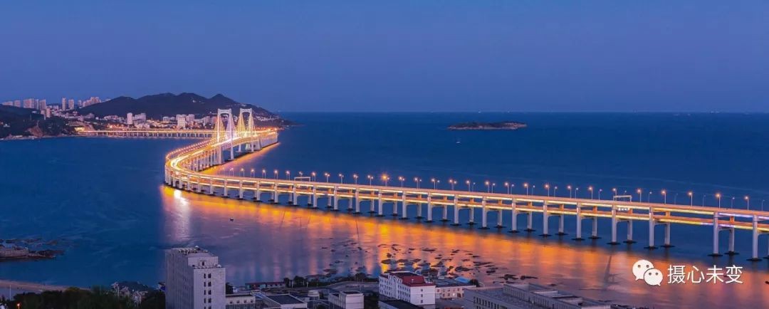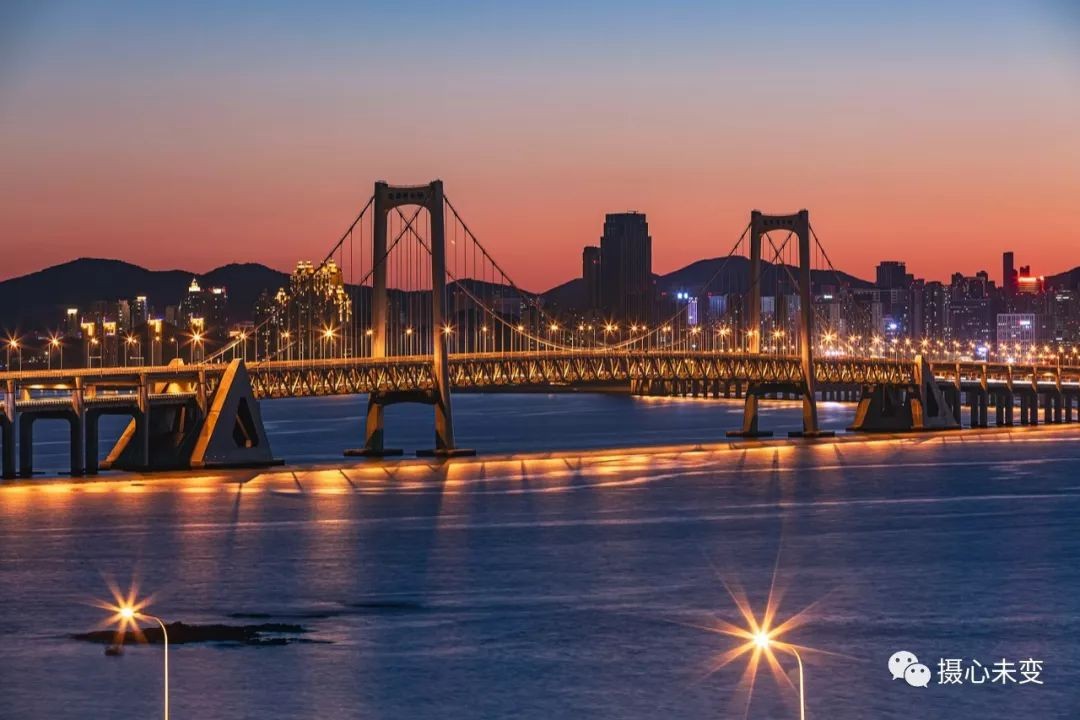 傍晚时分,华灯初上,霓虹璀璨,星海湾大桥夜色迷人,在灯光的点缀下,大桥的层次通过不同色彩变幻呈现,流光溢彩,美轮美奂...