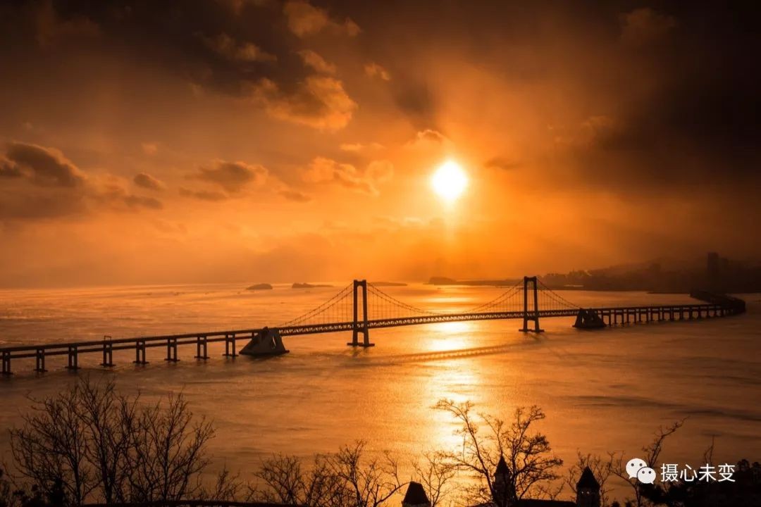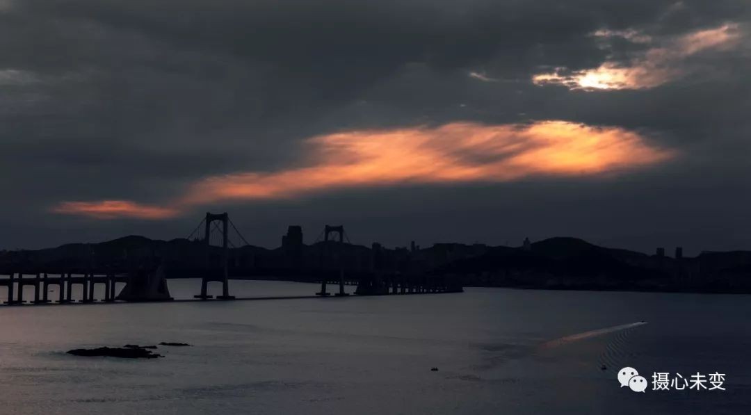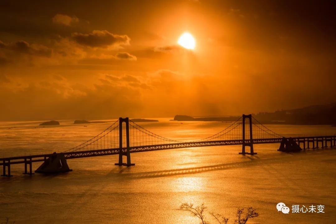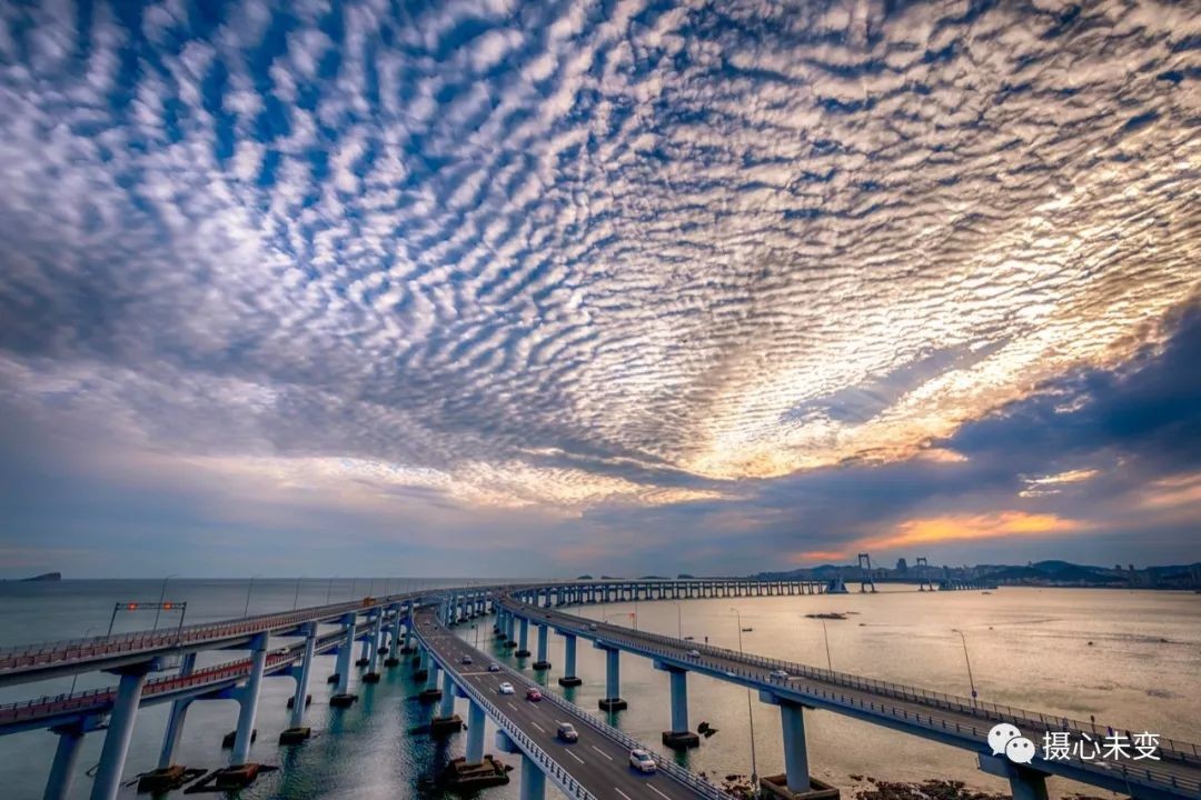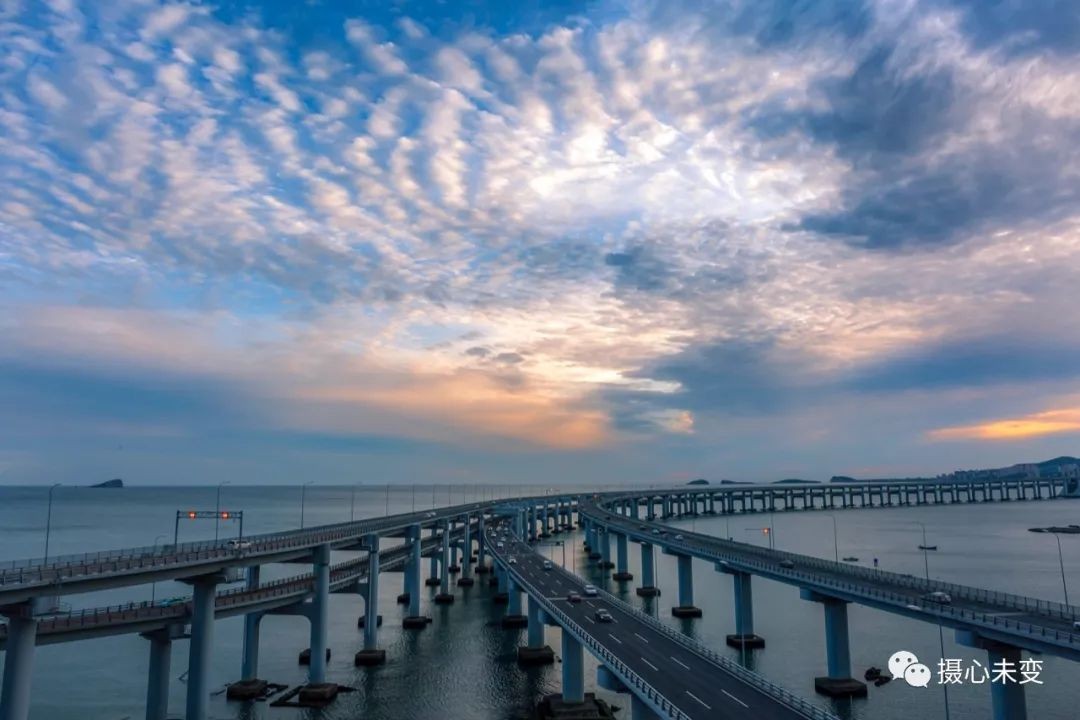 日落之前,阳光透过云层,洒下一片金黄,大桥的倒影映于海面,与大海、夕阳、晚霞交织一起,如梦似幻...