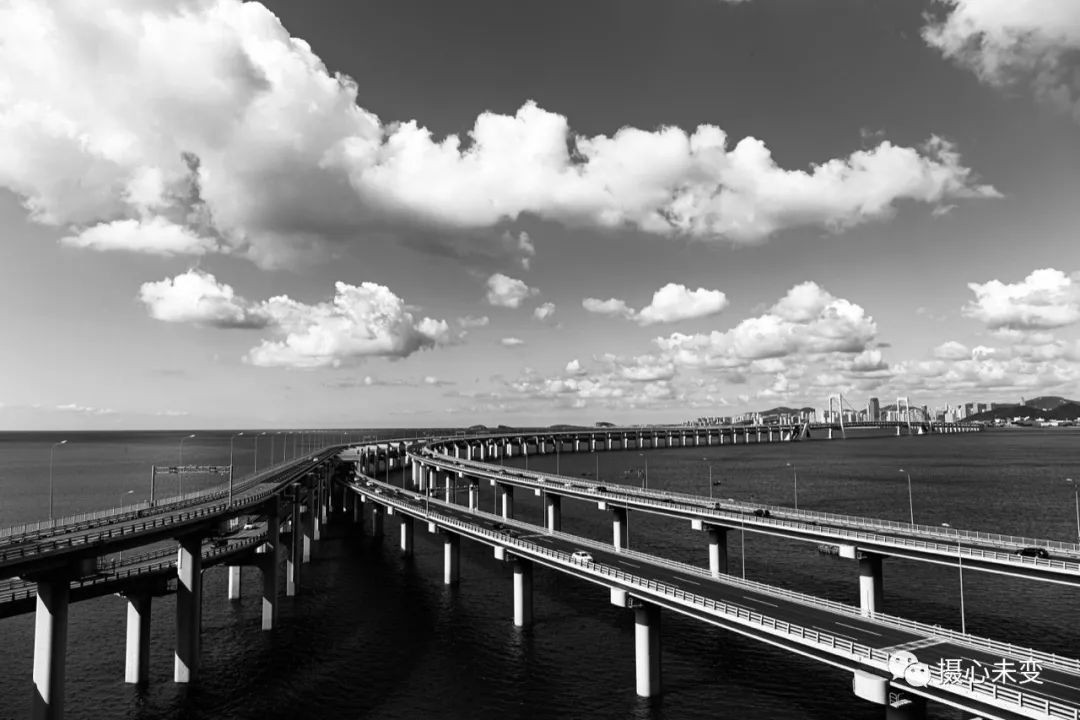 主桥平行于星海广场海岸线,在海面上以S形曲线走向,犹如一条长龙横卧在黄海水域上;