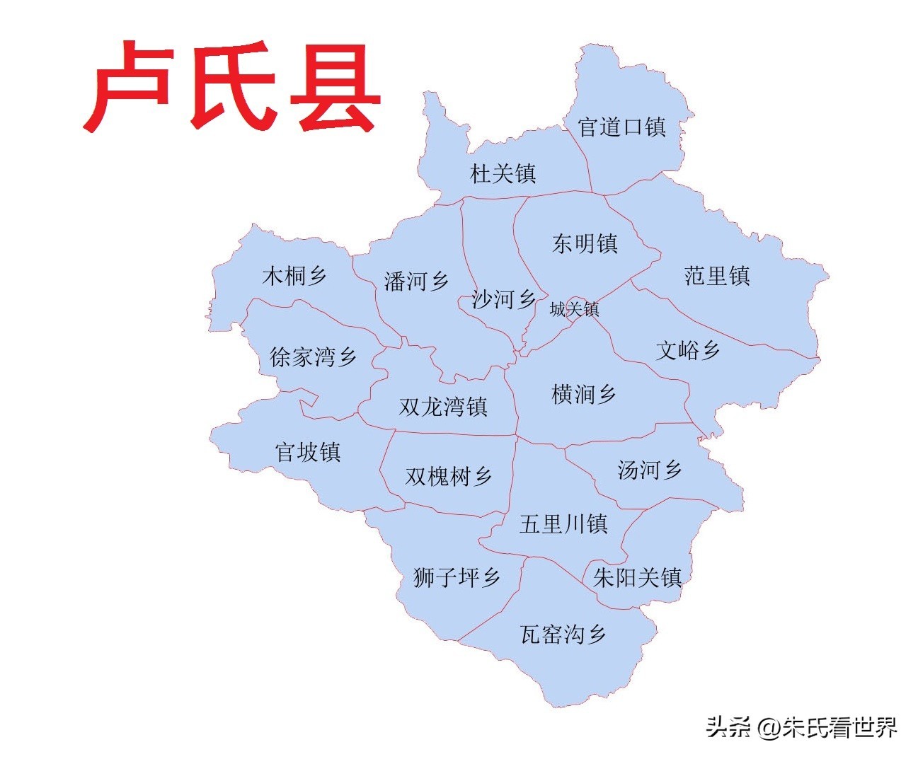 卢氏县总面积3664平方公里,下辖9个镇、10个乡,即:城关镇、杜关镇、五里川镇、官道口镇、朱阳关镇、官坡镇、范里镇、东明镇、双龙湾镇、文峪乡、横涧乡、双槐树乡、汤河乡、瓦窑沟乡、狮子坪乡、沙河乡、徐家湾乡、潘河乡、木桐乡。截至2022年末,卢氏县户籍总人口37.79万人 。