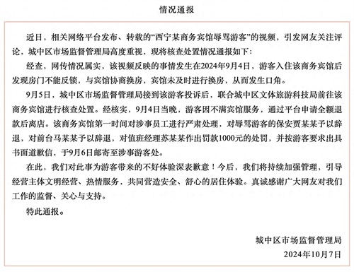 10月7日,城中区市场监督管理局发布情况通报。近日,相关网络平台发布、转载的“西宁某商务宾馆辱骂游客”的视频,引发网友关注评论,城中区市场监督管理局高度重视,现将核查处置情况通报如下: