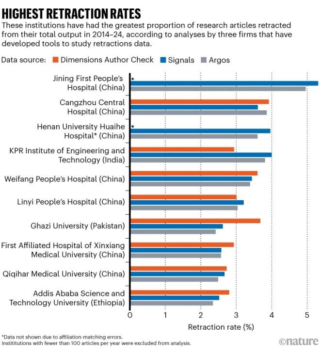 在《自然》统计的撤稿率前十机构中,中国机构占据七席,且均为医院及医学院。除济宁市第一人民医院外,河北沧州市中心医院、河南大学淮河医院分列二三位,撤稿率约为 3.5% 左右。此外,潍坊市人民医院、临沂市人民医院、新乡医学院第一附属医院、齐齐哈尔医学院也进入前十。其他三席则由巴基斯坦的加齐大学、埃塞俄比亚 “亚的斯亚贝巴”(Addis Ababa) 理工大学、印度 KPR 工程技术学院占据。