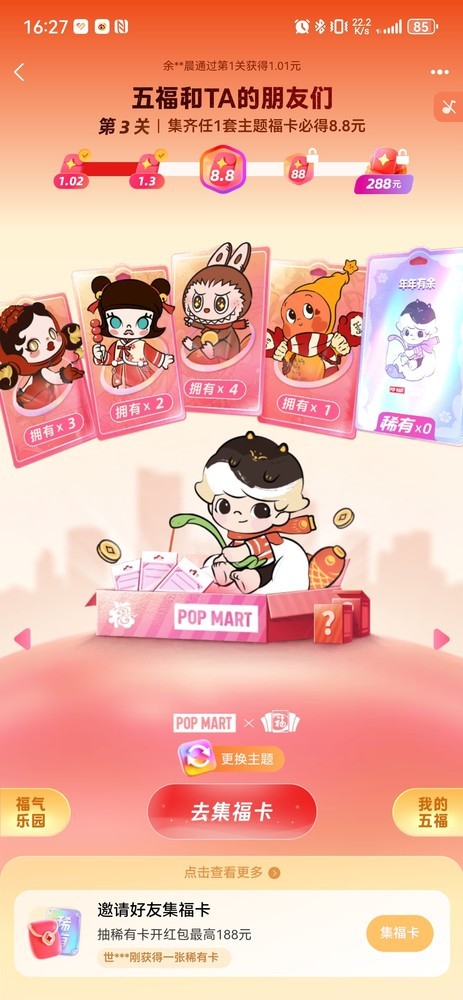 五、邀好友得福卡。邀好友可抽稀有卡,还能开红包,算是比较简单粗暴的方式,就看大家是i人还是e人了。