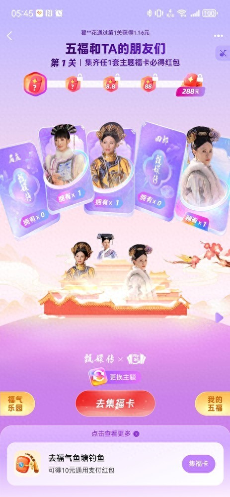 而且,五套福卡的集成难度是不一样的,前两套难度低,第三套稍难,第四套是大师级难度,第五套是王者级难度。按照今年的设定,可能最后五套福卡都集齐的用户并不会像往年传统五福那么多了,所以在红包金额上可能会更大一些。