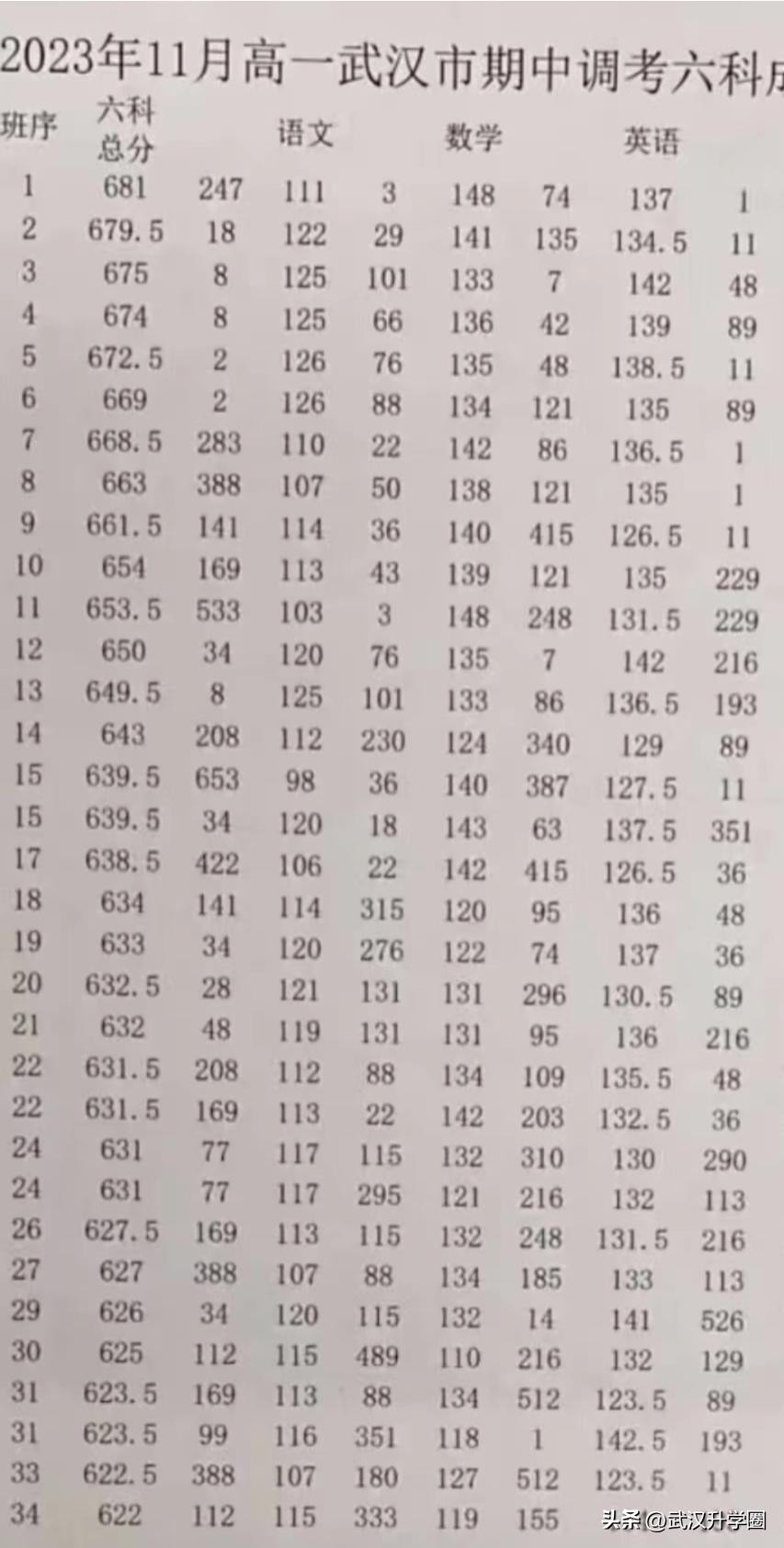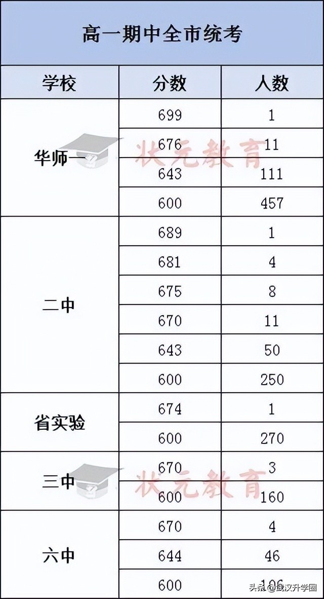 本次统考华师一600分以上457人、武汉二中600分以上250人、省实验600分以上270人、武汉三中600分以上160人、武汉六中600分以上106人。
